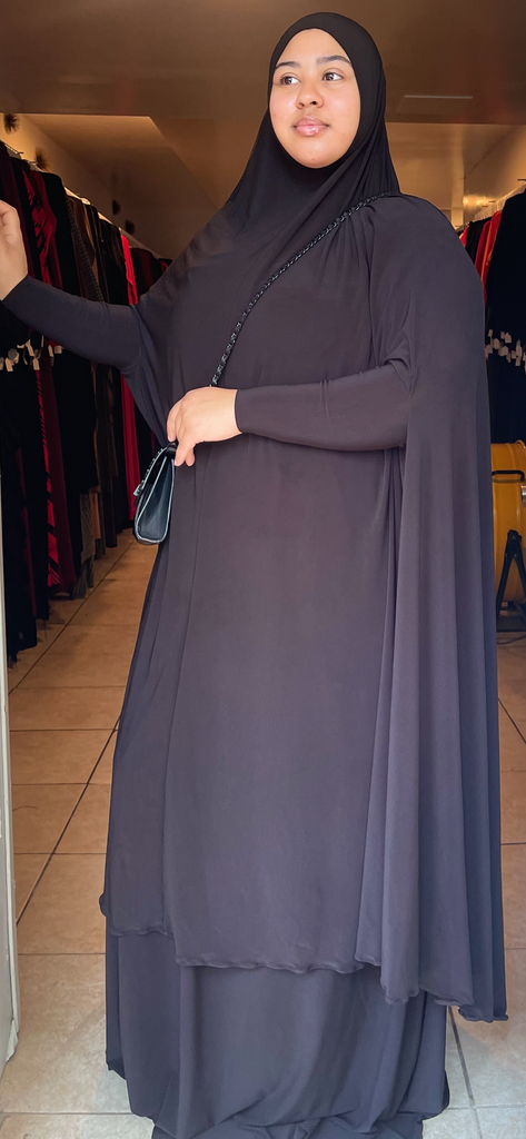 This khimar piece is sold with a sleeveless undergarment. The length stops between the knee and the shin. The khimar goes on top of garment. This item is one size fits most.
